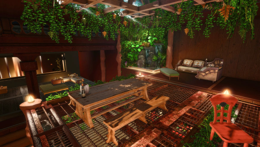 こちらはバリ風のイメージ。木のブラウンと植物のグリーンでまとめています。「リラックス」がテーマのエリアです。