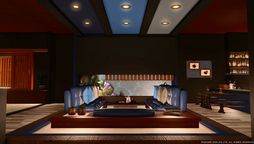 開放感のある、中庭風の小上がりです。天井の高さを生かしつつ、窓・照明・封印石でかなり明るくなるよう作っています。幅広の階段や棚周りは和風な雰囲気です。